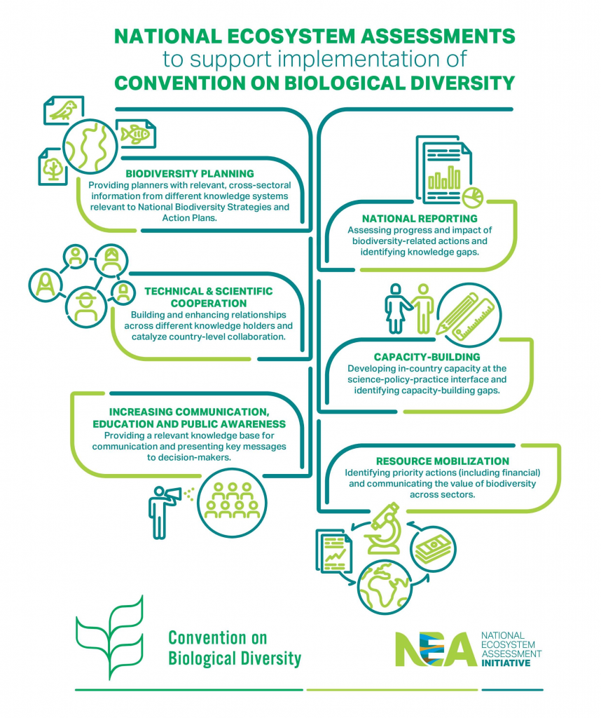 In 2018, the Conference of the Parties to the CBD encouraged parties and governments to undertake national assessments of biodiversity, ecosystem functions, and ecosystem services (Decision 14/1). National ecosystem assessments can play an important role in supporting CBD implementation by providing a critical synthesis of policy-relevant knowledge on biodiversity and ecosystem services and enhancing national capacities at the science-policy interface.